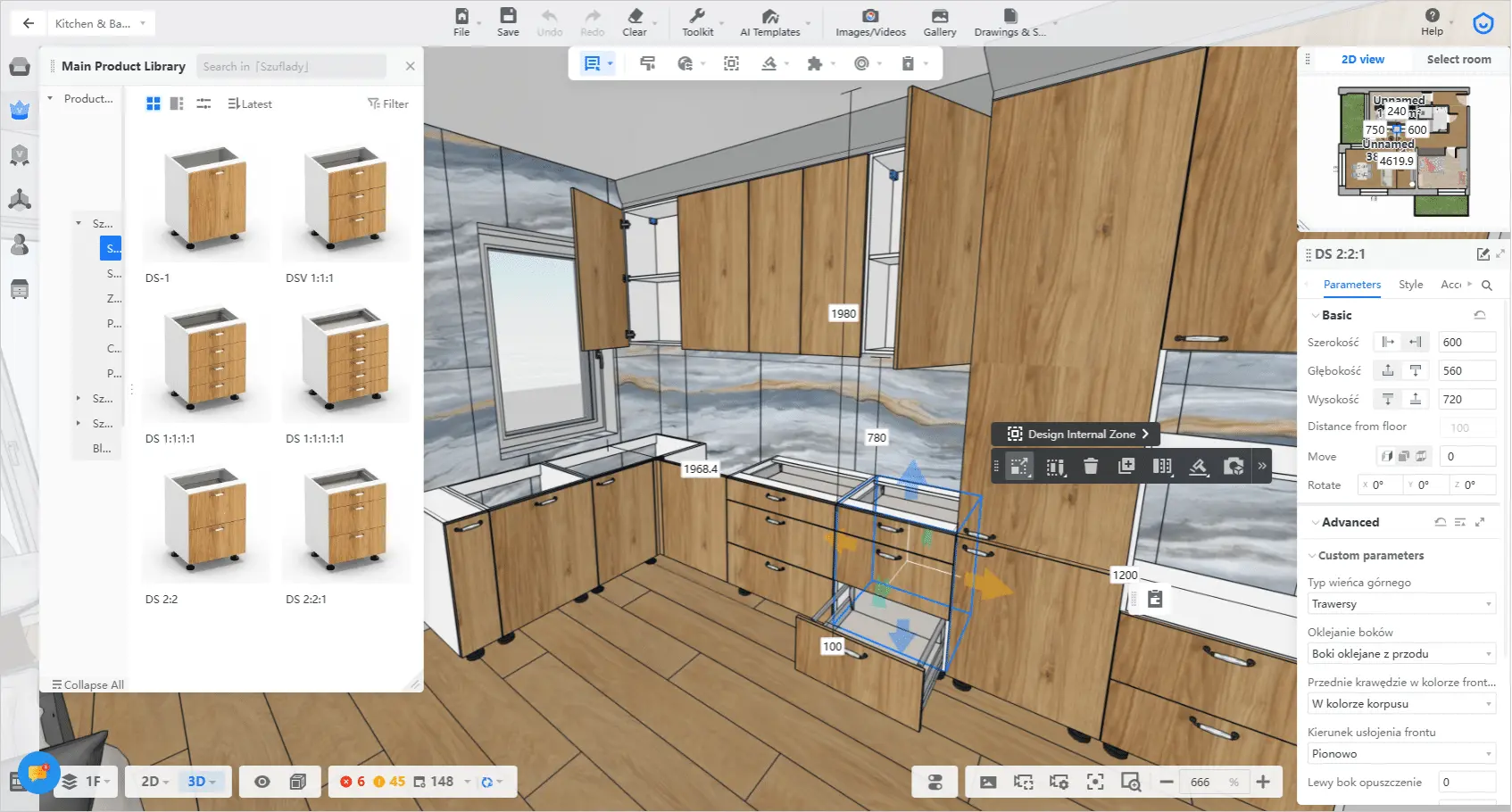Od szkicu do profesjonalnej wizualizacji kuchni w kilka klików. Narysuj pomieszczenie, wskaż szafki i AGD. AI zrobi resztę: perfekcyjny projekt gotowy jednym klikiem – wszystko z wykorzystaniem modeli parametrycznych, dzięki którym projekt jest faktycznie możliwy do realizacji.