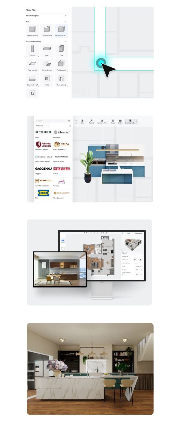 - Biblioteka Coohom zawiera tysiące: – szafek i frontów w różnych systemach, – blatów (laminat, kamień, konglomerat, spiek), – uchwytów, okuć i relingów, – sprzętów AGD, – oświetlenia sufitowego i podszafkowego, – dekoracji, które dodają projektowi realizmu. Każdy element można edytować — zmieniać kolory, tekstury, rozmiary i warianty.